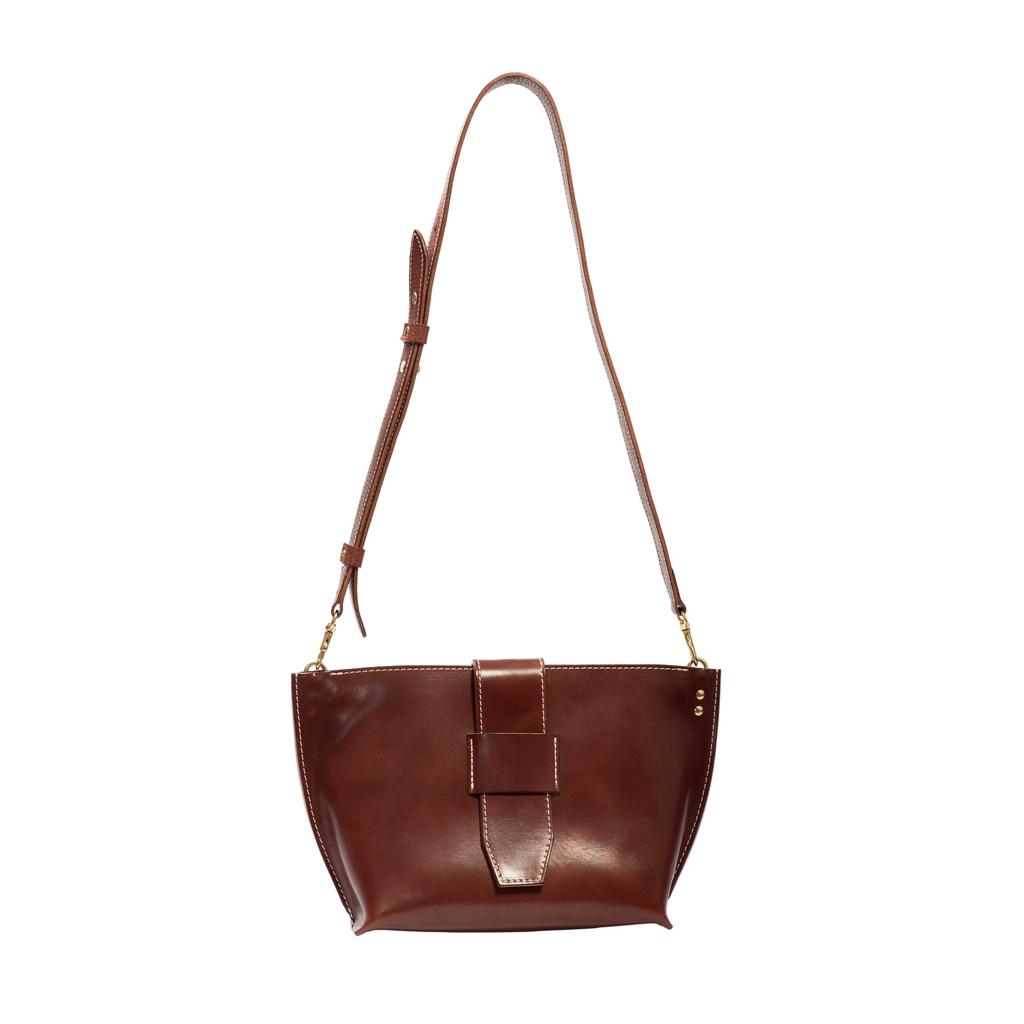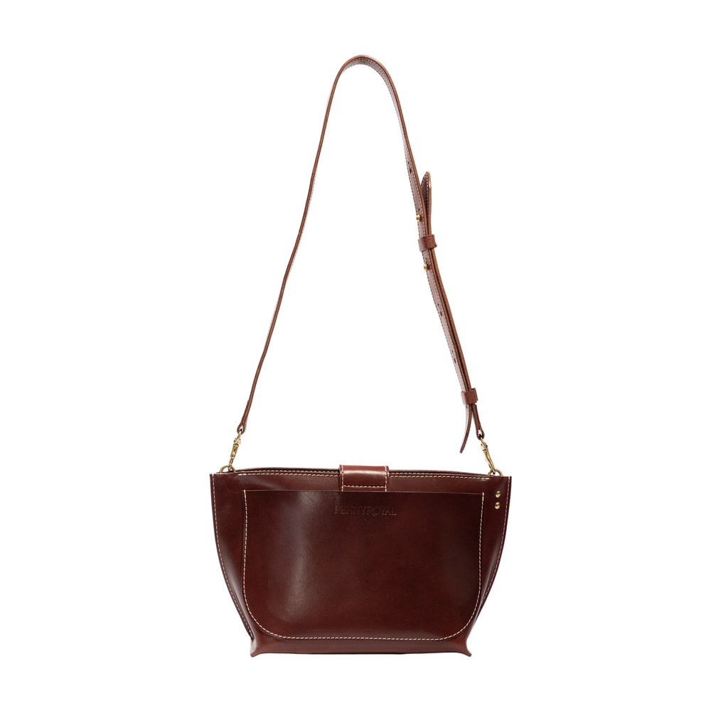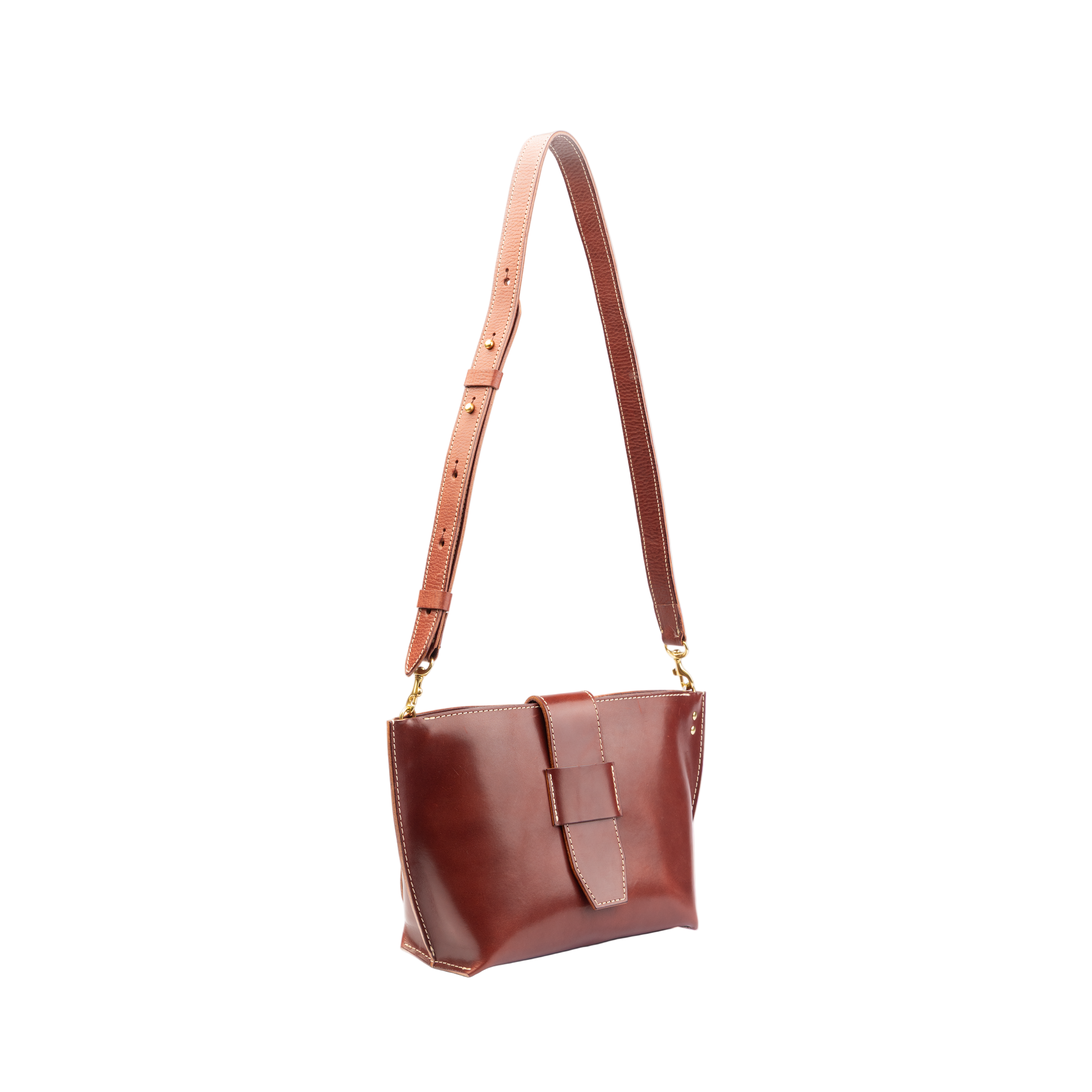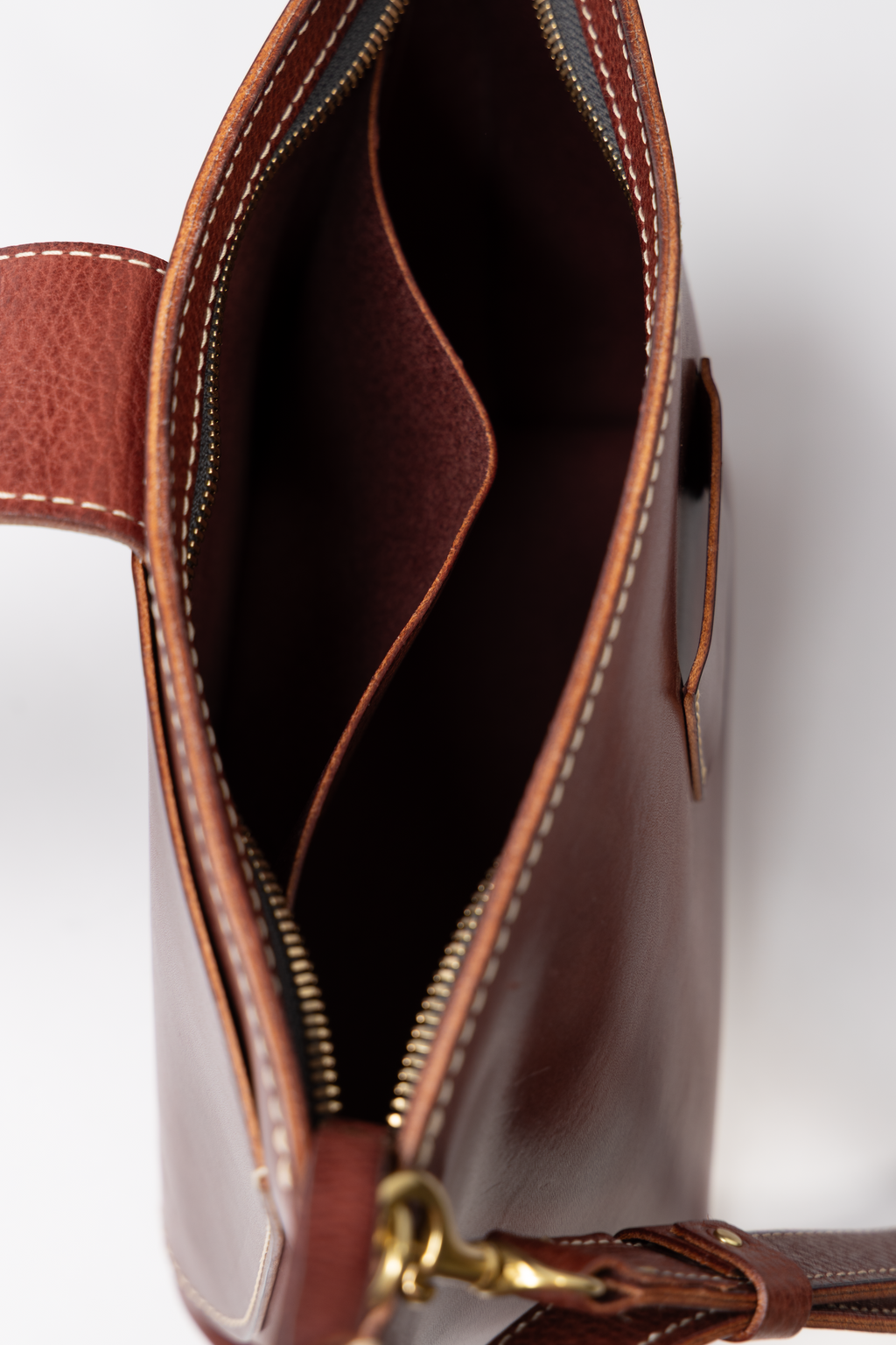Zippered top. One slip pocket inside and one on the back. Adjustable strap.