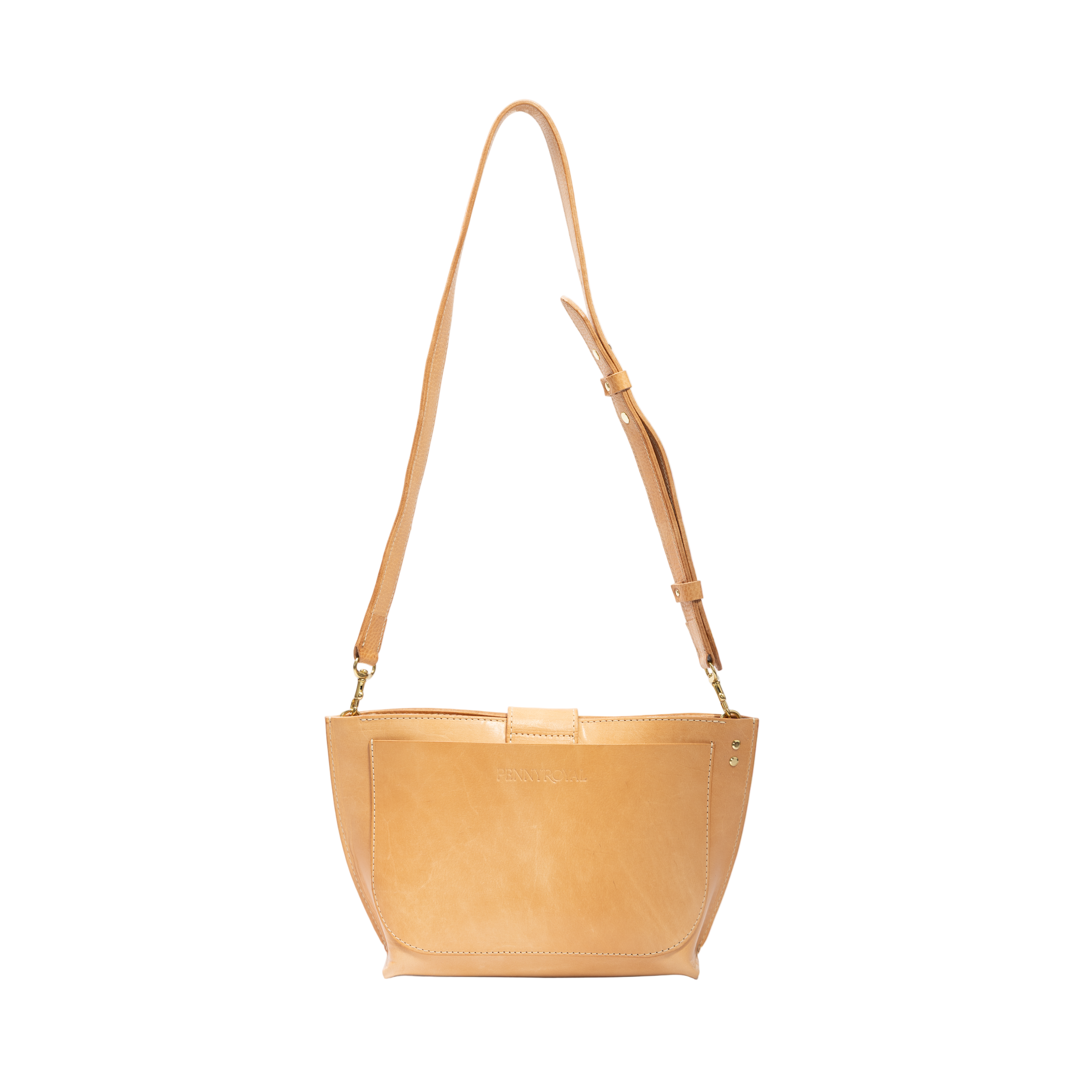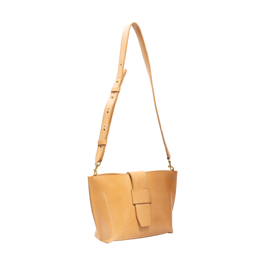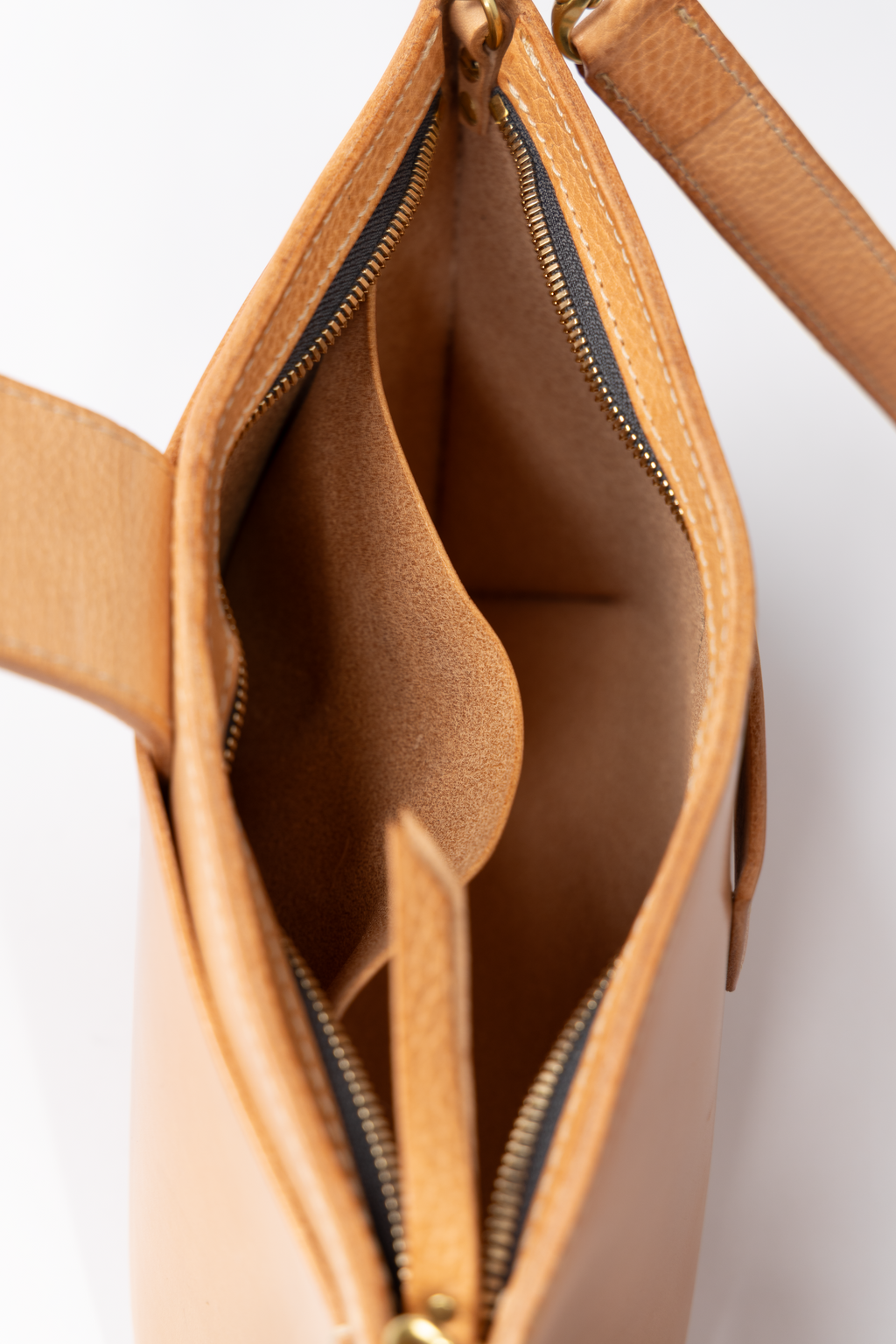 Zippered top. One slip pocket inside and one on the back. Adjustable strap.