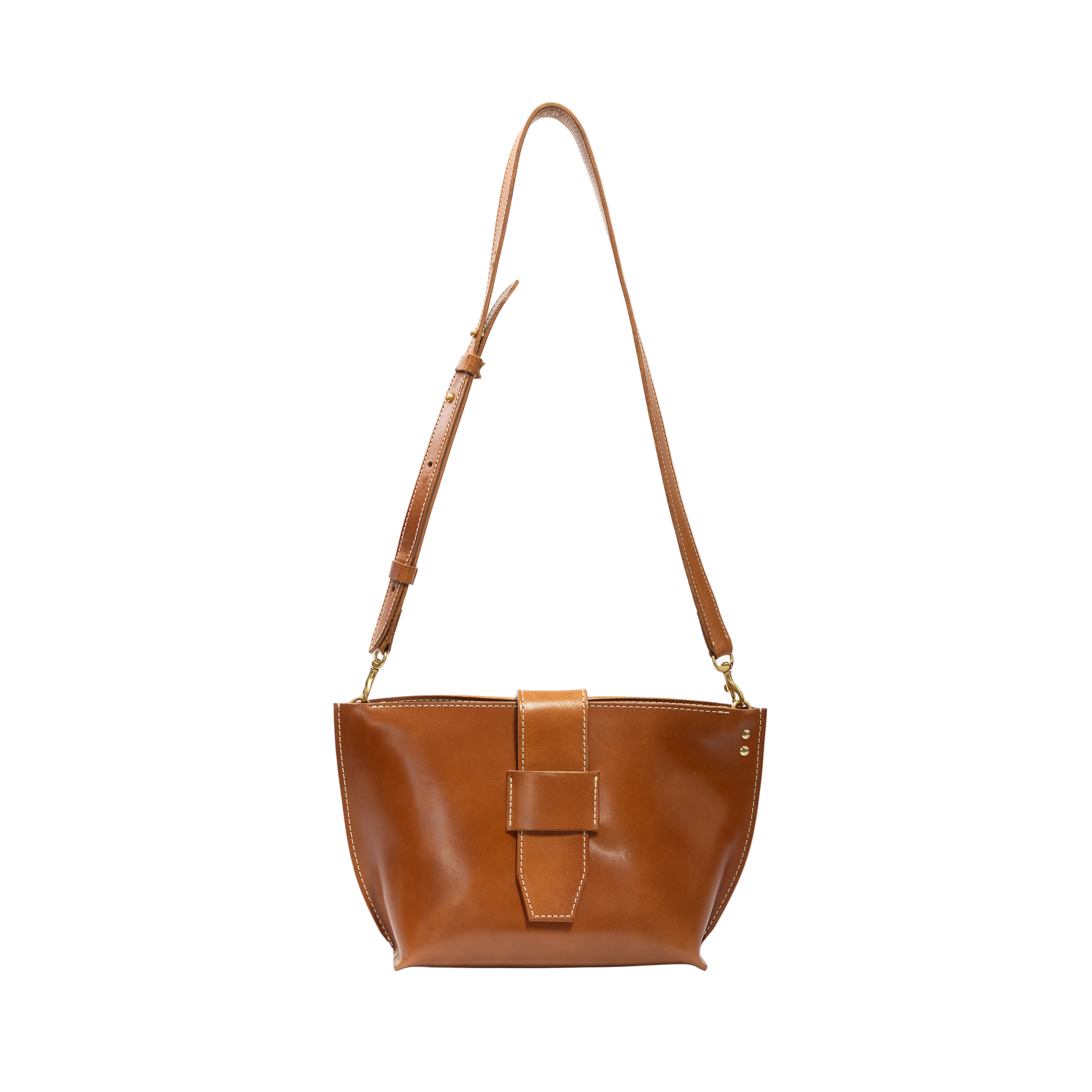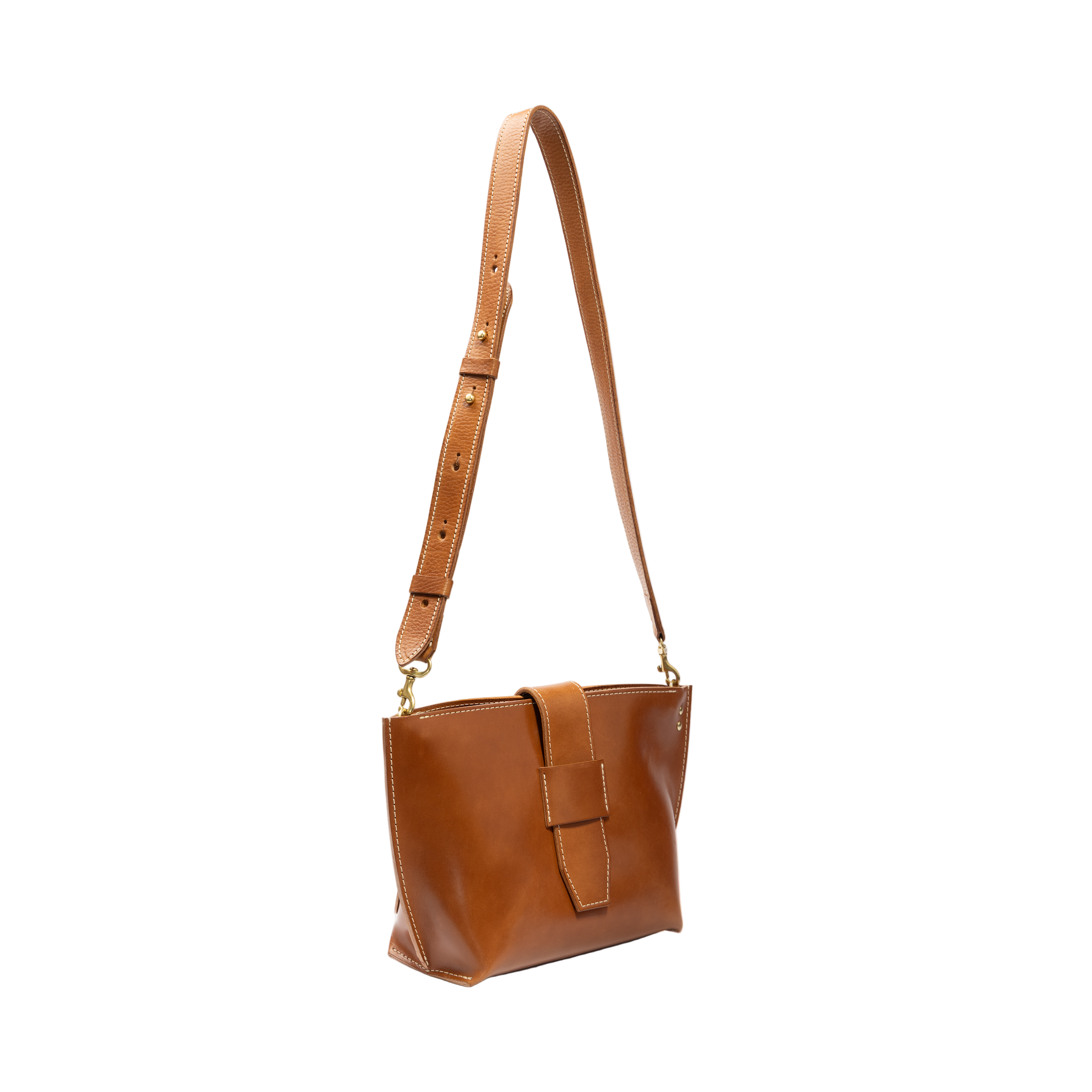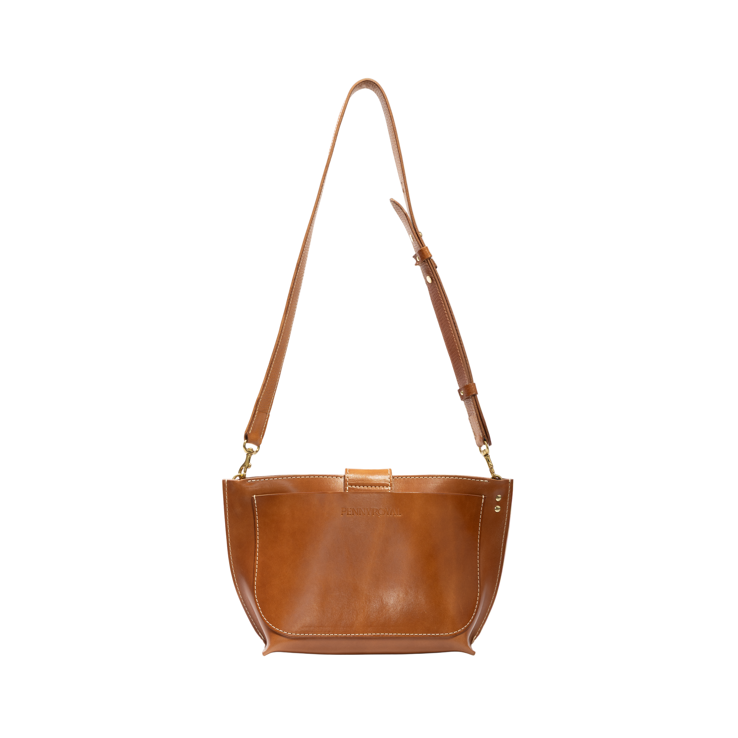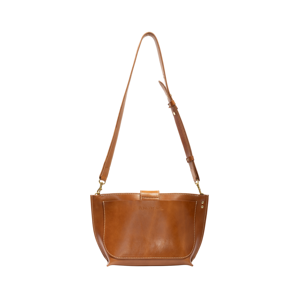 Zippered top. One slip pocket inside and one on the back. Adjustable strap.