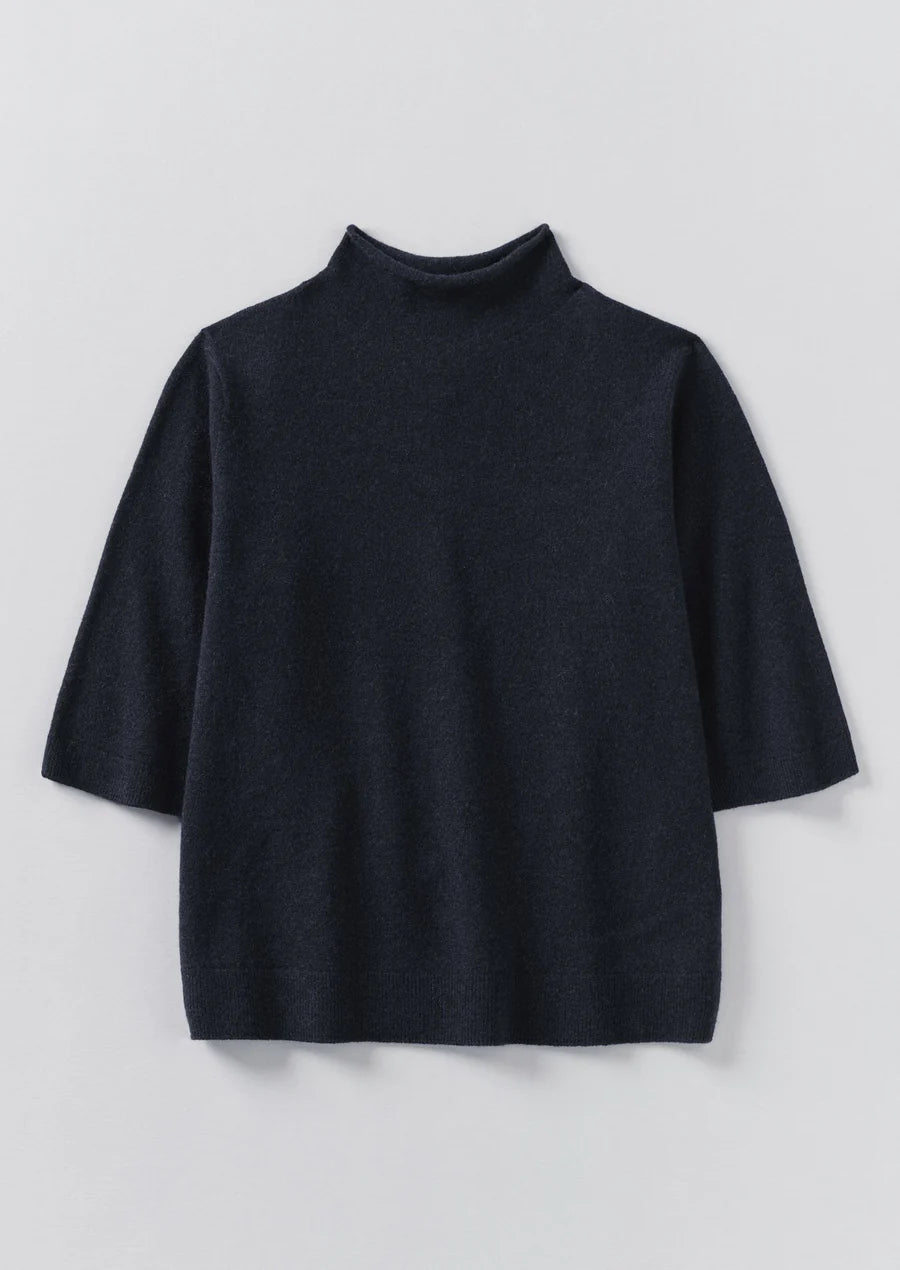 Wool and cashmere blend. Easy shape. Rolled high neck. Elbow-length sleeves. Mid-hip length. Integral ribbed cuffs and hem.