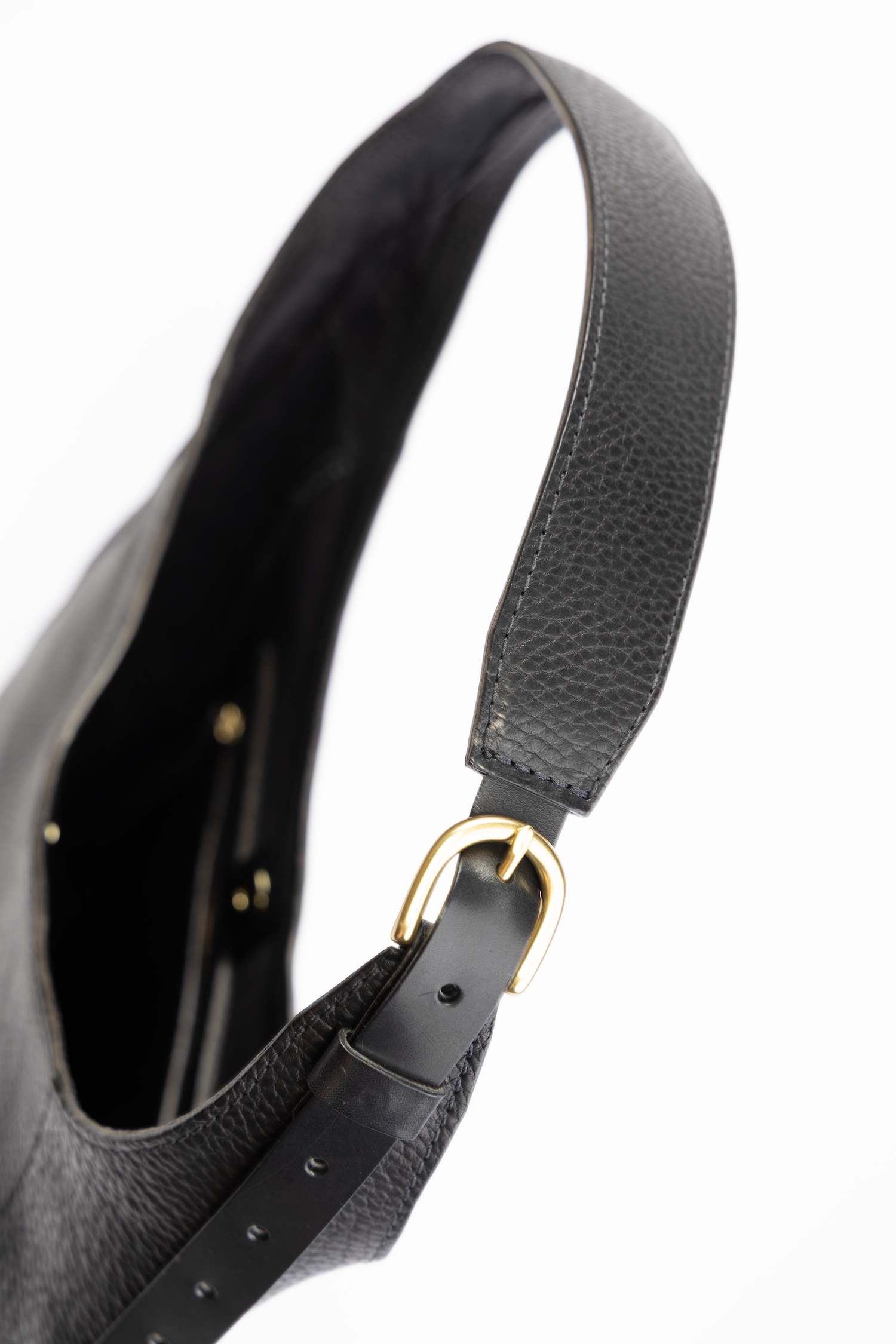 Adjustable shoulder strap with a solid brass buckle. The top closes tight with a nice magnetic snap. It includes one large zippered pocket.