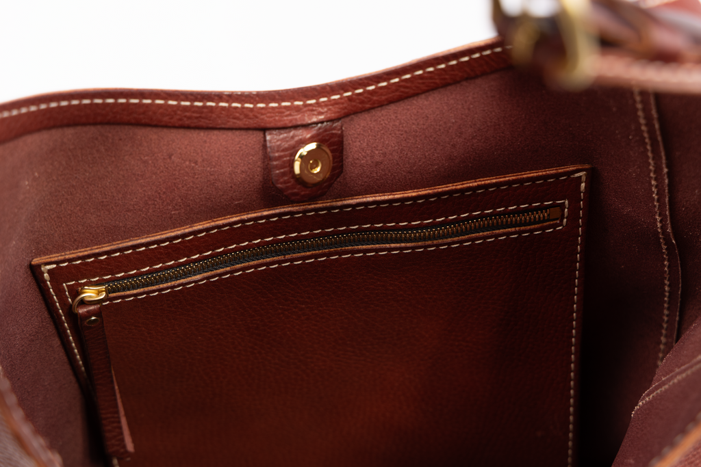 All our bags are made with American sourced fully vegetable tanned leather. When exposed to sunlight, oils and water, the leather will grow darker over time and develop a lovely dark patina. This patina is natural and is what gives this type of leather its coveted color.