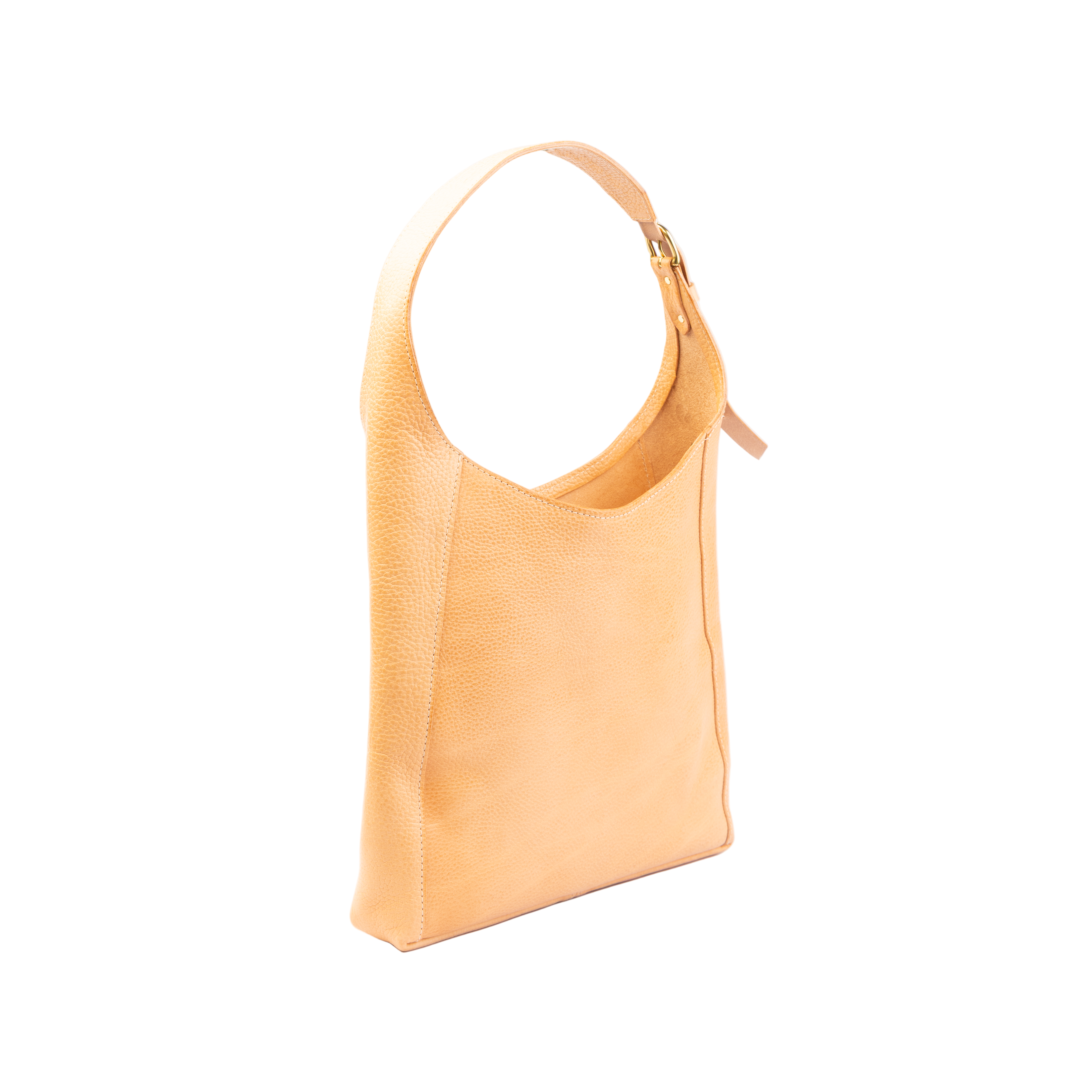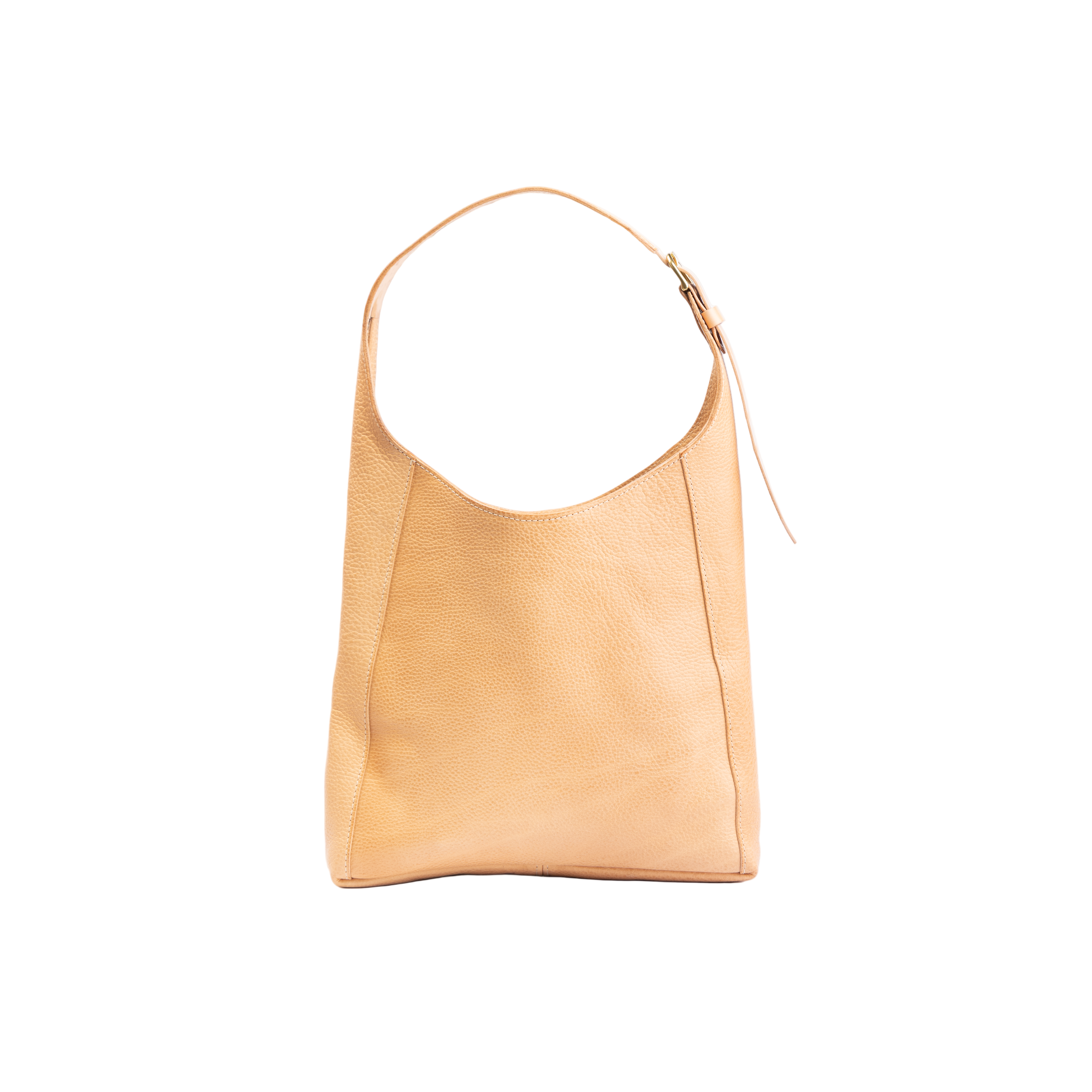 Adjustable shoulder strap with a solid brass buckle. The top closes tight with a nice magnetic snap. It includes one large zippered pocket.