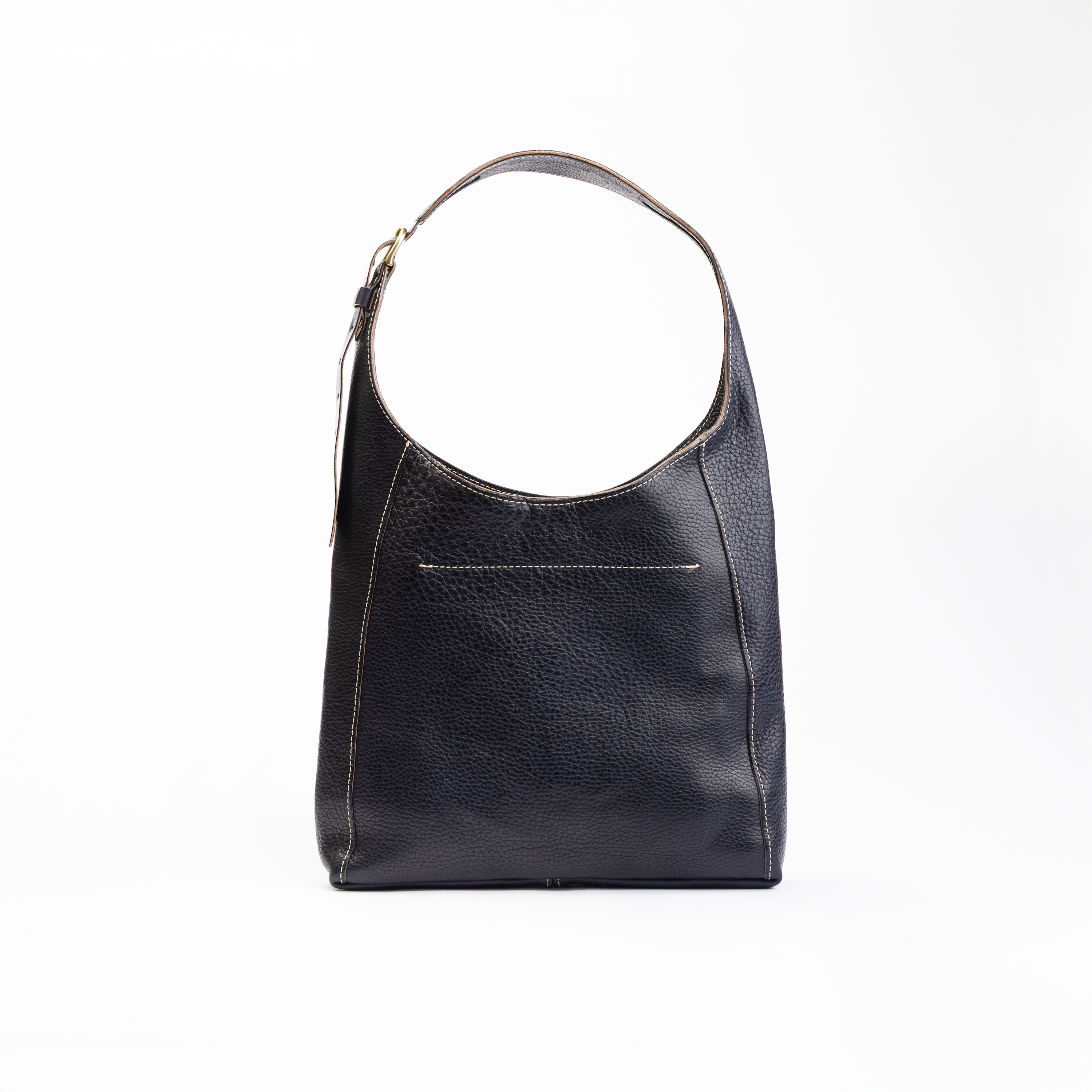 Adjustable shoulder strap with a solid brass buckle. The top closes tight with a nice magnetic snap. It includes one large zippered pocket.