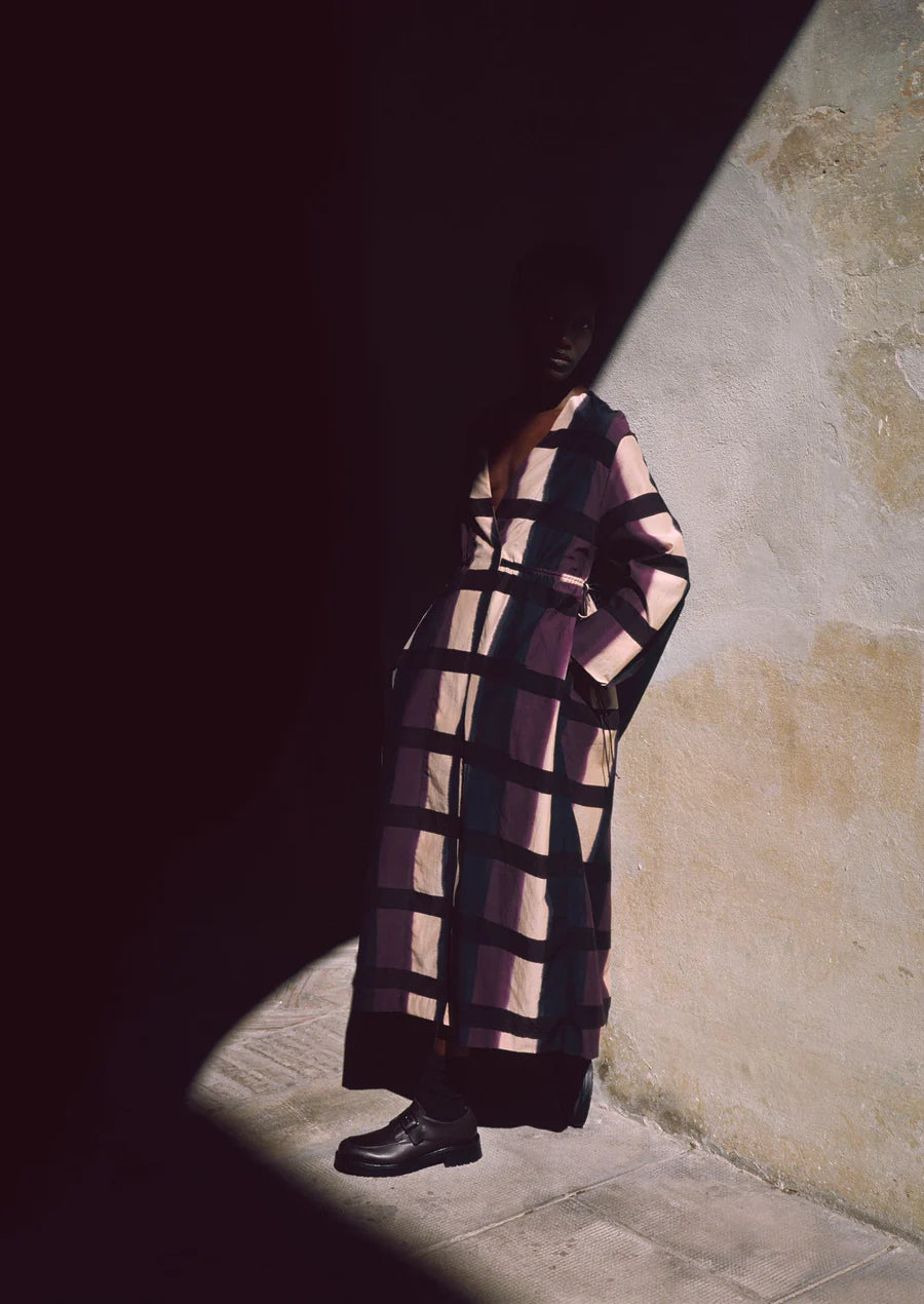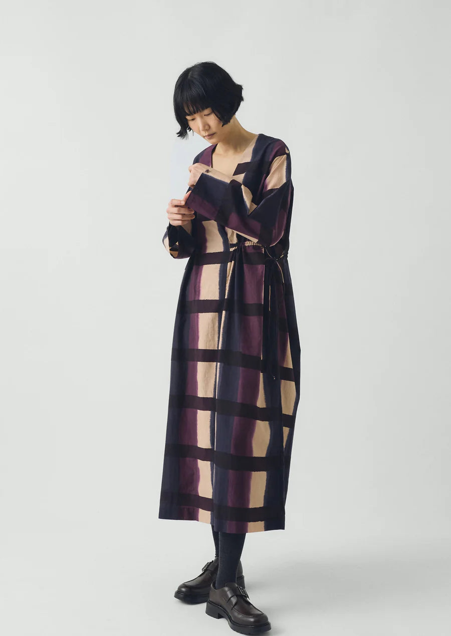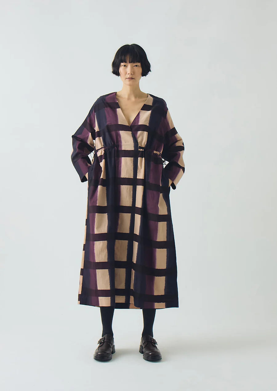 Hand-painted by artisans in Uttar Pradesh, India with our Shadow Still print, our dress is cut from an organic cotton and silk blend. Shaped with a crossover V-neck and a tactile gathered drawstring waist, then finished with buttoned cuffs.