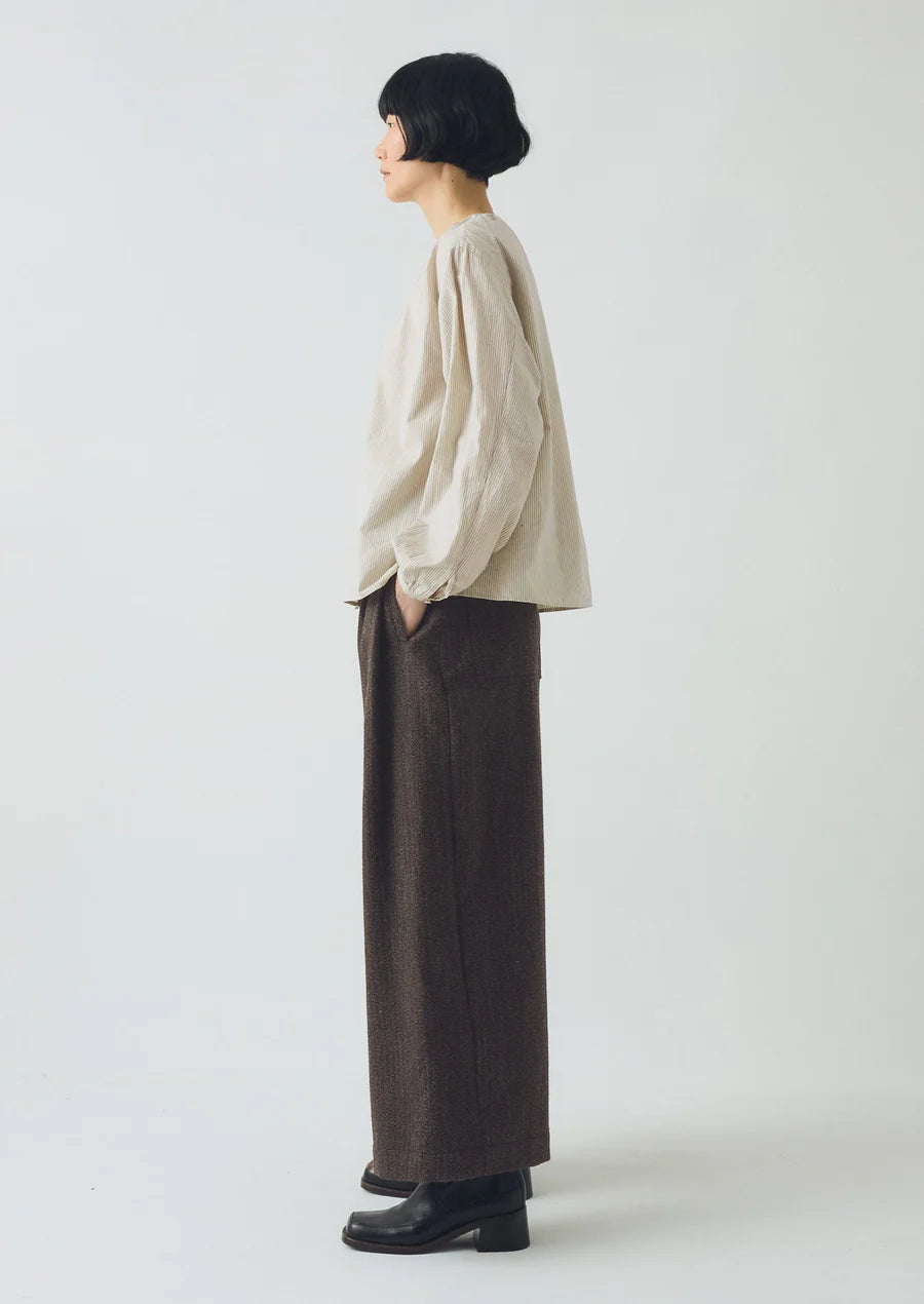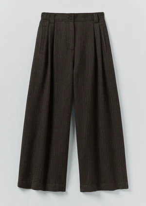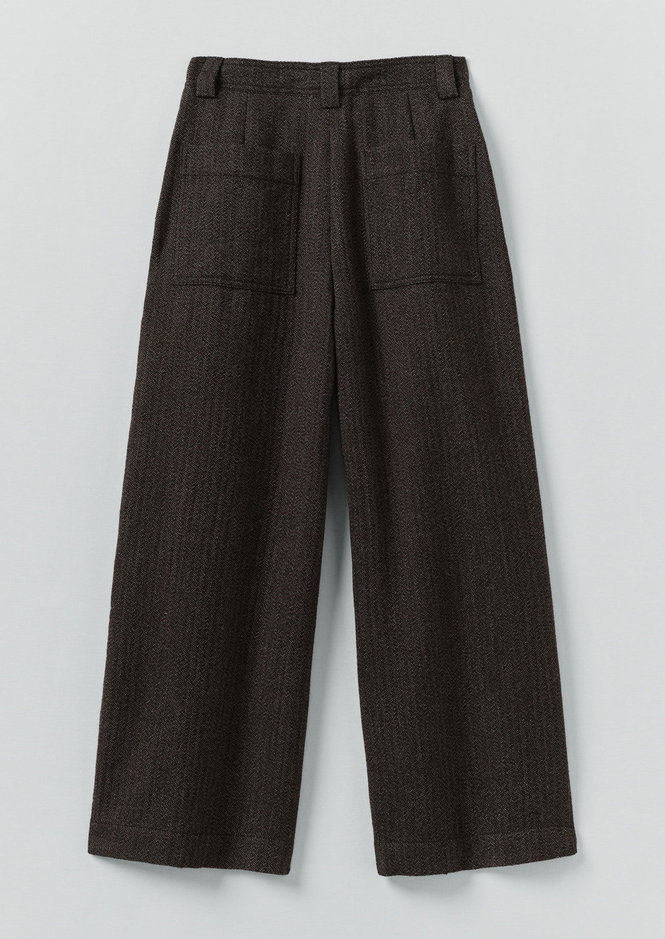 Made from melange wool with a herringbone weave. Double knife pleats to the front bring subtle volume, with dart shaping at the back. Welt pockets maintain the clean silhouette. Finished with twin topstitching.