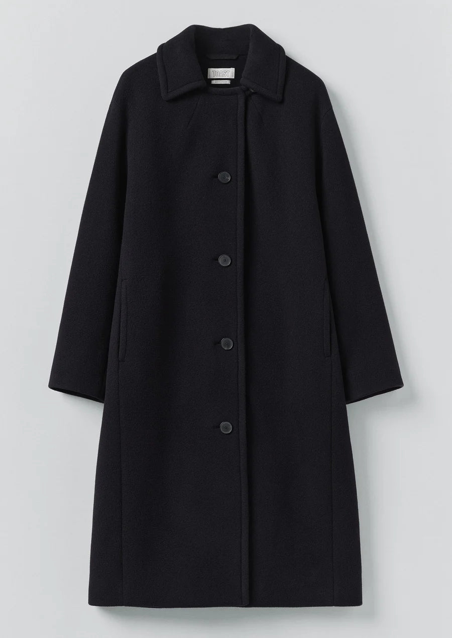 The conservatoire coat is made from a blend of boiled wool and recycled nylon, cut to an oversized, rounded shape with a topstitching at the collar. Falling to the upper calf and finished with in-seam pockets and horn buttons.