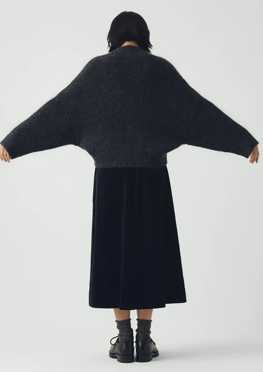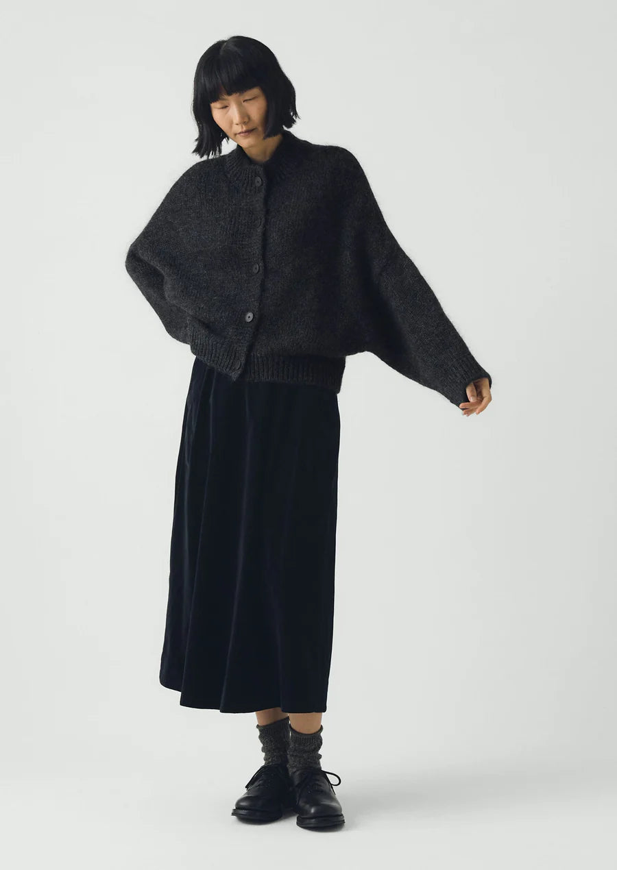 Our soft wool and mohair blend cardigan is shaped with a high ribbed neck and rounded sleeves, creating a sculptural silhouette. The dipped back hem enhances its rounded form, while corozo buttons and ribbed trims complete the design.